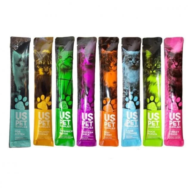 بستنی گربه یو اس پت ساخت کشور چین یک میان وعده عالی و خوشمزه برای گربه دلبندتان در طعم های: ، شترمرغ و بیوتین، کیتن (ریکاوری)، بوقلمون و علف گربه، بره و ویتامین، مرغ و سیب، بیف و تمشک، اردک و پاپایا، سالمون و میگو